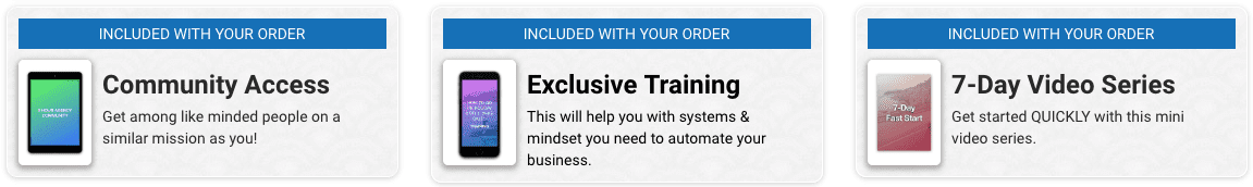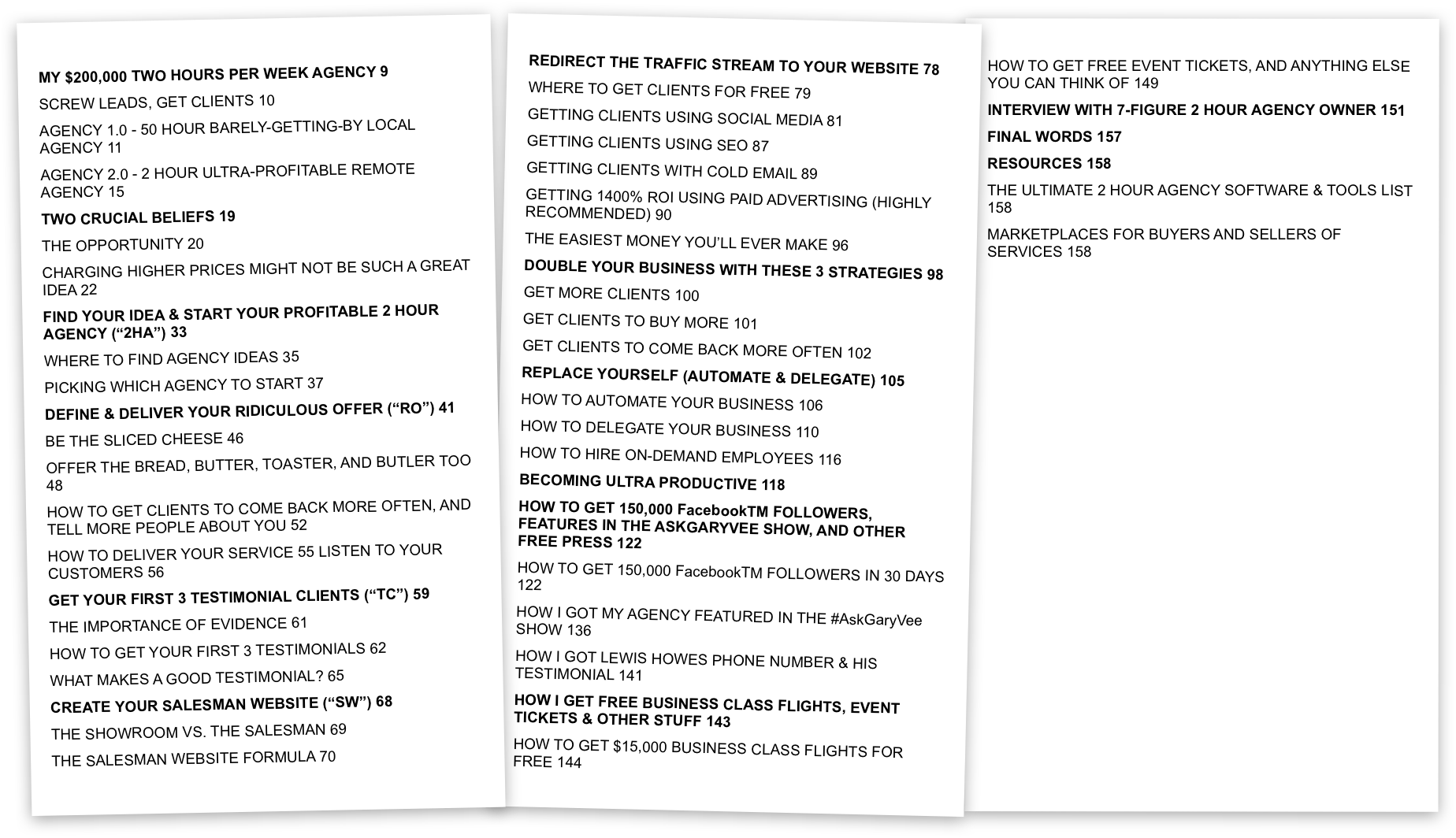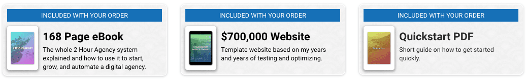 This 2 Hour Agency special offer really is special. We wanted to make it so good that you'd feel stupid by not ordering it if having an online business that gives you freedom is of any interest to you. What you'll get in this special offer includes the 2 Hour Agency eBook, a free video training about how I get 6 - 10 new clients per month, an Agency Website Template that is responsible for doing over $700,000 in digital services sales on autopilot, and you get the 2 Hour Agency Quickstart Guide PDF.