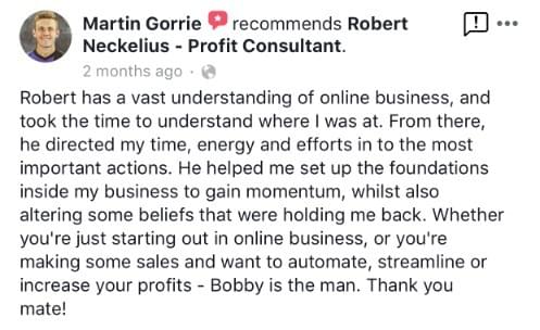 "...Well I read his book on Friday last week. I just sold my first $597 package today. I’ve joined a million other courses only to be let down. This was finally the jump start I needed. I feel more sales will be coming now..."